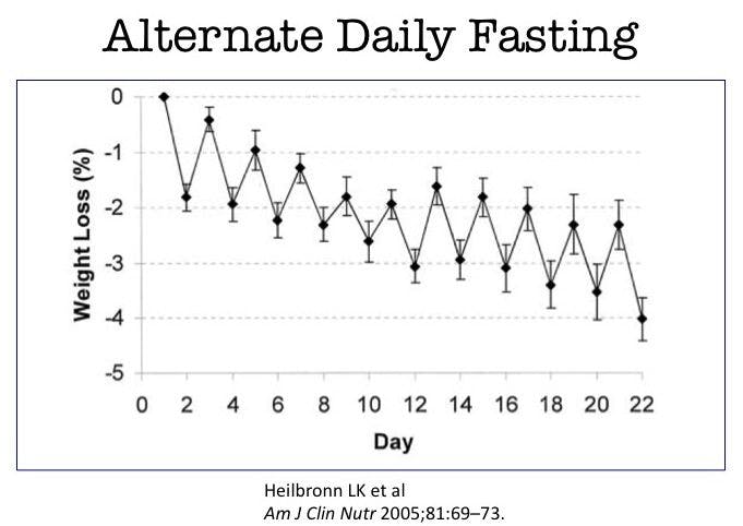 Longer fasting regimens – 24 hours or more October 3 2016 by Dr. Jason Fung, MD, medical review by Dr. Bret Scher, MD in Dr. Jason Fung, Intermittent fasting 24 hours5:2Alternate dayRisks with longer fasts36 hours42 hours and beyond This post is about longer fasting periods – 24 hours or more – and how to do them. I arbitrarily divide it at 24 hours but there is no physiologic reason to do so, other than for classification purposes. There is no magic dividing line ad many consider 36 hours the cut-off for longer-term fasts. We covered fasting regimens using periods less than 24 hours previously. The longer regimens are generally done less frequently. The major determinant of which fasting regimen is right for you is a personal preference. Some people find longer fasts easier and some find them harder. Most people find that hunger increases into day 2. At that point, hunger peaks and then gradually recedes. This is important knowledge if you are attempting a longer fast (3-7 days). It is easier to continue knowing that hunger usually gets better. Disclaimer: While intermittent fasting has many proven benefits, it’s still controversial. A potential danger regards medications, especially for diabetes, where doses often need to be adapted. Discuss any changes in medication and relevant lifestyle changes with your doctor. Full disclaimer This guide is written for adults with health issues, including obesity, that could benefit from intermittent fasting. Learn more. People who should NOT fast include those who are underweight or have eating disorders like anorexia, women who are pregnant or breastfeeding, and people under the age of 18. Learn more. Around one day long fasting periods 24-hour fasts A 24-hour fast lasts from dinner to dinner, or breakfast to breakfast, whatever you like. For example, you would eat dinner at 7 pm and then fast until the next day’s dinner at 7 pm. In this regimen, you do not actually go a full day without eating since you are still taking one meal on that ‘fasting’ day. This is very similar to the ‘Warrior’ style of fasting although that allows a 4-hour eating window so is technically a 20-hour fasting period. This period of fasting has several important aspects. Because you still eat every day, medications that need to be taken with food can still be taken. For example, metformin, or iron supplements, or aspirin should all be taken with food and can be taken with the one meal on the fasting day. The major advantage of 24-hour fasting is that it is easily incorporated into everyday life. Most people, for example will eat dinner with family every single day. As you still eat dinner every day, it is possible to routinely fast for 24 hours without anybody knowing any different, since it really only means skipping breakfast and lunch on that day. This is particularly easy during a workday. You simply drink your morning cup of joe, but skip breakfast. You work through lunch and get home in time for dinner, again. This saves both time and money. There is no cleanup or cooking for breakfast. You save an hour at lunchtime where you can work, and be home for dinner without anybody even realizing you had fasted for 24 hrs. For weight loss, in our Fasting Method program, we’ll recommend this schedule of 24-hour fasting to be done as much as three times per week. One of the main worries of fasting is the loss of lean body mass, or muscle. Many studies have been done on this and these fears are largely misplaced, especially for overweight or obese individuals and for fasts less than three days. In one study, fasting every other day did not produce any loss of lean body mass over 22 days, even as body weight steadily decreases. Another name for a similar fast is OMAD, short for One Meal A Day. What you need to know about OMAD The 5:2 diet A related approach is the 5:2 approach championed by Dr. Michael Mosley, a TV producer and physician best known for popularizing this approach. He appeared on a BBC program called Horizon entitled “Eat, Fast, and Live Longer”. While there had been some fringe interest generated by pioneers such as Martin Berkhan and Brad Pilon, fasting had not really hit the mainstream yet. With the BBC documentary and the book that soon followed, intense interest, especially in the UK followed. The book, entitled “The Fast Diet” became a best seller in the UK and soon other follow up books were released. The basic diet was not quite a 24-hour fasting period. Instead, the 5:2 diet consisted of 5 days of normal diet. On the other two days, you could eat a total of 500 calories. Those 500 calories could be taken all in a single meal. If, for example, this is taken as dinner, it would be identical to a 24-hour fast. However, you could spread those 500 calories out into multiple meals instead. These two approaches are quite similar and the difference physiologically, is likely quite minimal. Alternate daily fasting (ADF) This is the dietary strategy that has the most research behind it. Much of it was done by Dr. Krista Varady, an assistant professor of nutrition with the University of Illinois – Chicago. She wrote a book about her strategy in The Every Other Day Diet, although this was not the blockbuster success of the 5:2 diet. Even though it sounds like you only eat every other day, it is not quite true. You can eat up to 500 calories on fasting days, just like in the 5:2 diet. However, fasting days are done on alternate days rather than 2x per week so it is a more intensive regimen. The major advantage of this regimen is that more research is available on this regimen than any other. We will consider these studies in more detail in later posts. Risk of complications of fasts >24 hours As you progressively go longer in fasting, the benefits may accrue faster, but there is also more risk of complications. Since I often deal with patients with type 2 diabetes and hard to treat obesity cases, I tend to gravitate towards longer fasts,