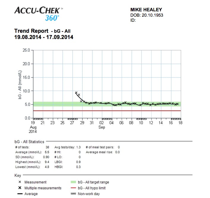 I declined the drugs, bought a blood tester and after the shock of seeing 169 mg/dl (9.4 mmol/l) went on a very low-carb, high-fat diet. 21 days in and I have lost 16 lbs (7 kg) and my BG is normal. See attached trend report.