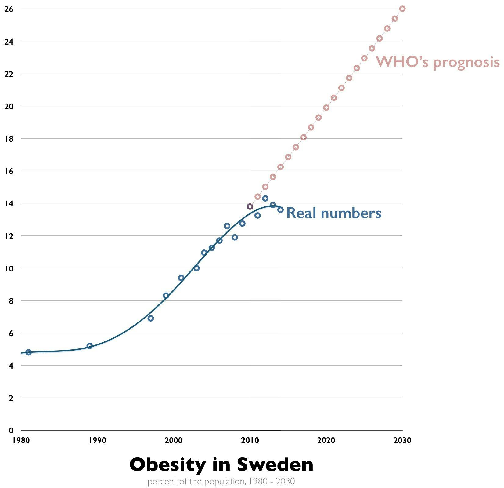 The headlines are based on a new WHO report on the spread of obesity in Europe. Sweden – my country – is among the leanest of European countries today, with 14 percent of the population classified as “obese”. But the report predicts a major increase in obesity over the next two decades, to 26 percent.