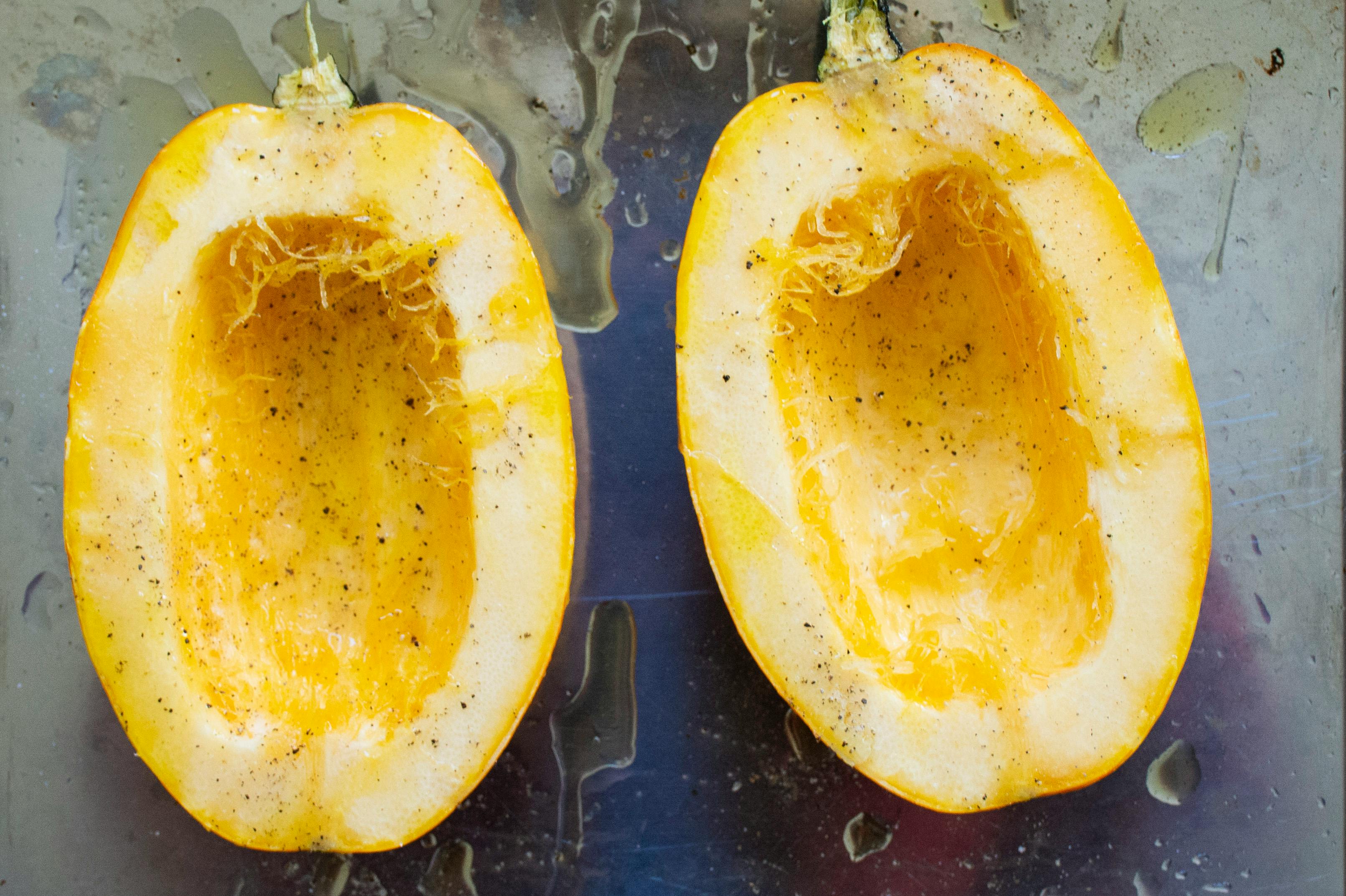 3. Place halves with the cut side up in a large baking dish or baking tray. Brush with olive oil, season with salt and pepper. Place in the oven and bake the spaghetti squash until soft, for about 30-40 minutes, depending on the size. If you need more help dealing with the pumpkin, scroll down for more detailed instructions with pictures.
