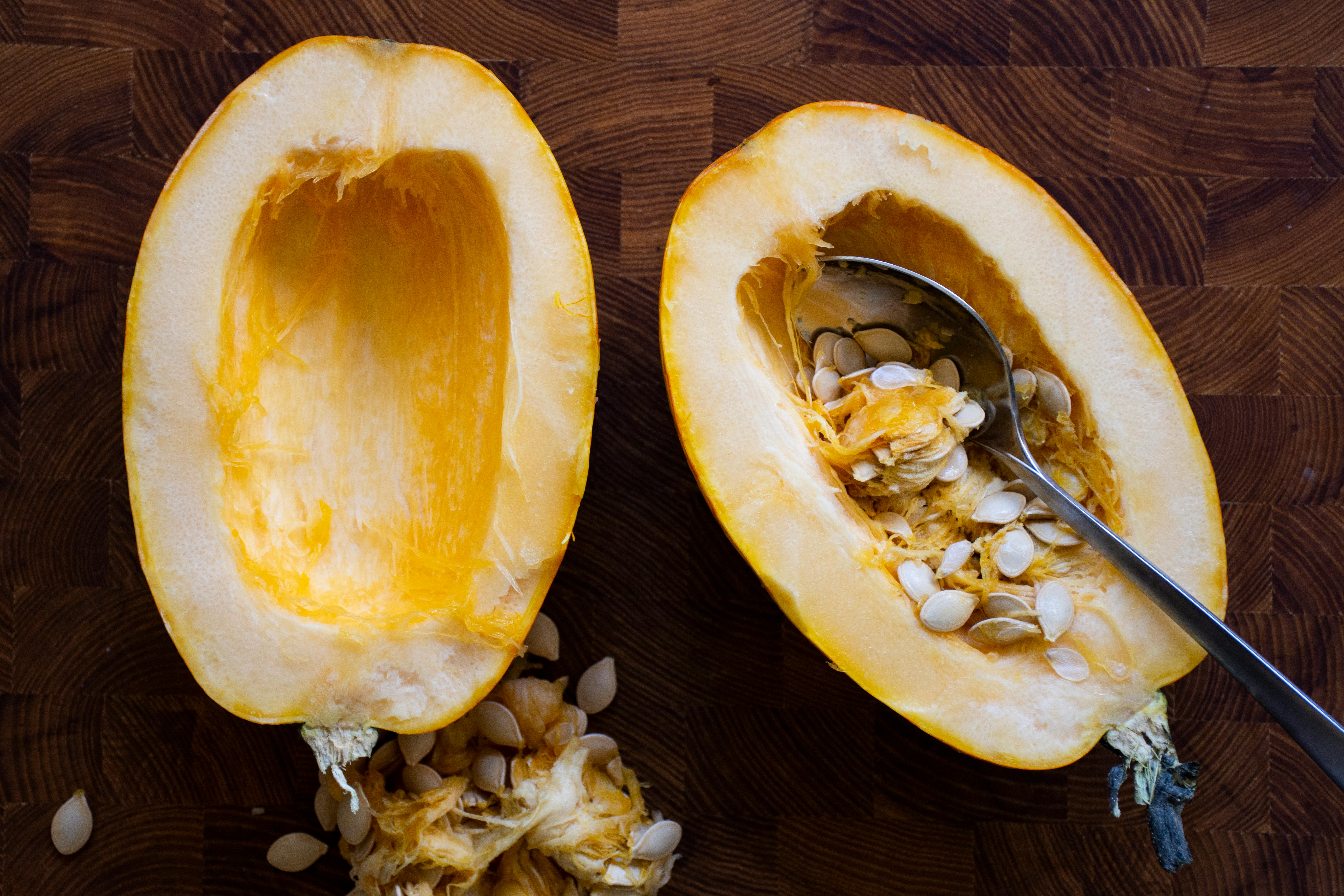 2. Slice spaghetti squash in half by cutting lengthwise with a sharp knife. Be careful, it can be quite hard. Scoop out the seeds and fibers with a spoon.
