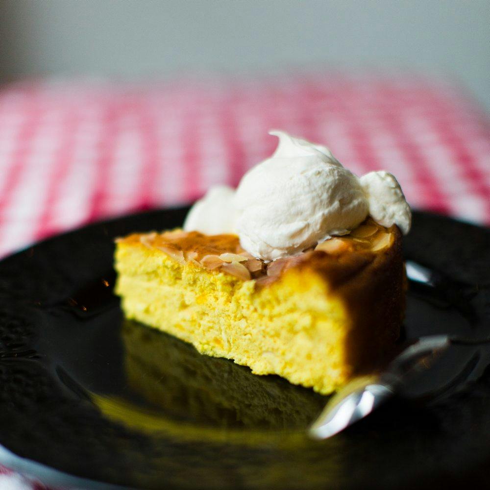 Servera den ljumma ostkakan med lättvispad vispgrädde.