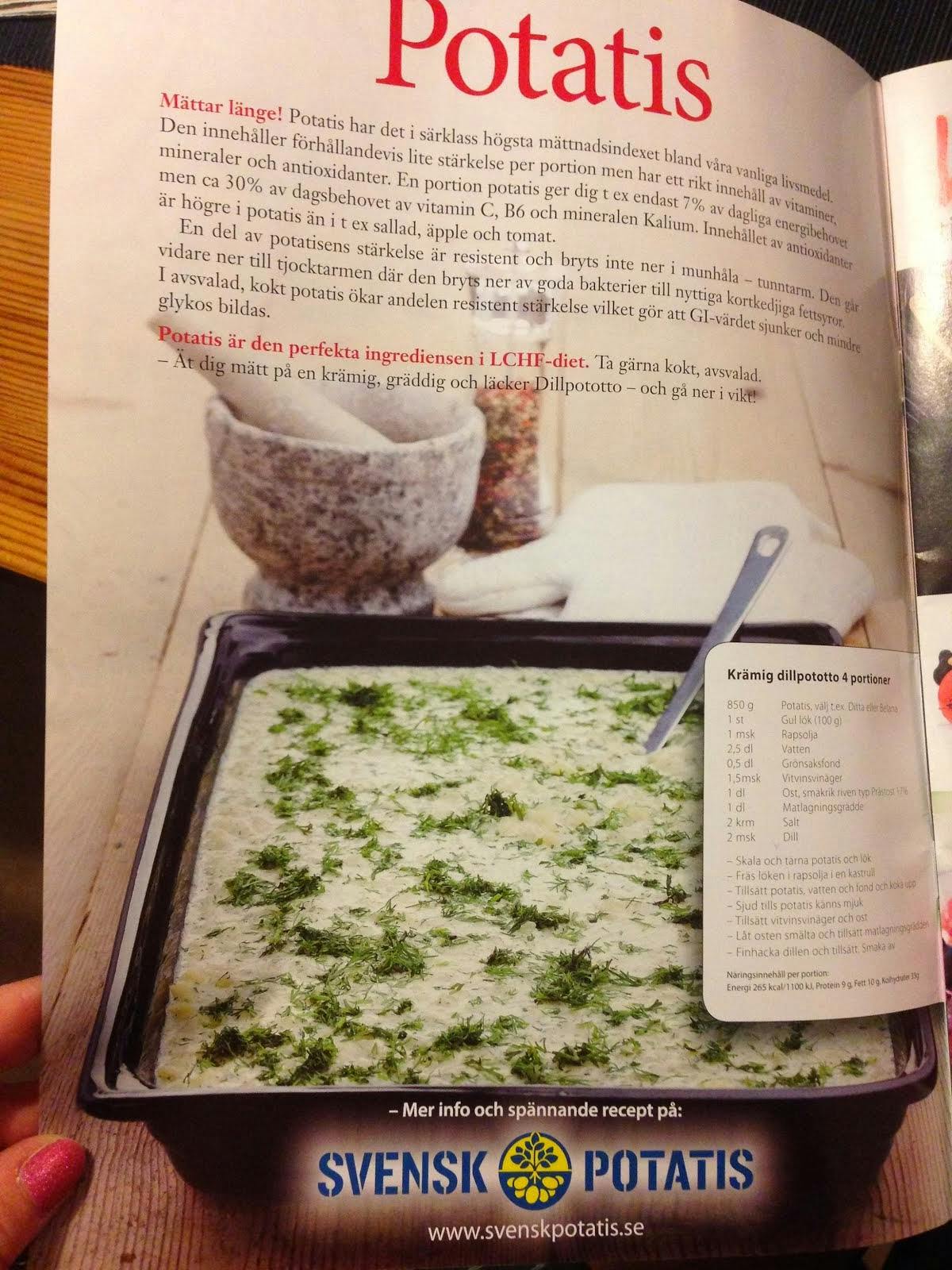Enligt annonsen så är den kolhydratrika potatisen ”den perfekta ingrediensen i LCHF-diet”. Man delar också med sig av ett recept på ”Krämig dillpototto”, komplett med fettsnål fejkgrädde och fettsnål ost. Den innehåller 50 energiprocent kolhydrater och är ungefär så långt ifrån LCHF man kan komma.