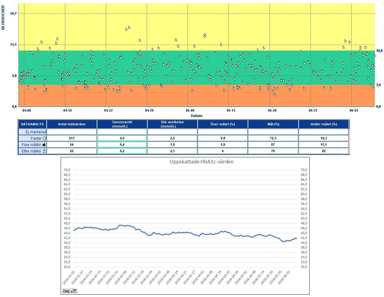 Under de senaste två veckorna har jag nu kontinuerligt kunnat hålla mig under 42, vilket är en efterlängtad seger för mig. Ett annat mål är att 90% av alla blodsockerprover ska vara under 10 mmol/l. Det har jag också nått under de senaste två månaderna. Det finns även andra mål jag har, t.ex att standardavvikelsen för alla prover ska vara under 2. Inte riktigt där än, men på väg.