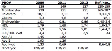 Första hälsokontrollen gjorde jag efter ca åtta månader på lchf. Sen har jag kört vartannat år. APO-kvoten glömde de ta 2013, jag fick åka in igen och lämna lite blod, sen ringde de mig om resultatet. Jag glömde skriva ner det. Hade det varit för jäkligt, hade jag kommit ihåg det.