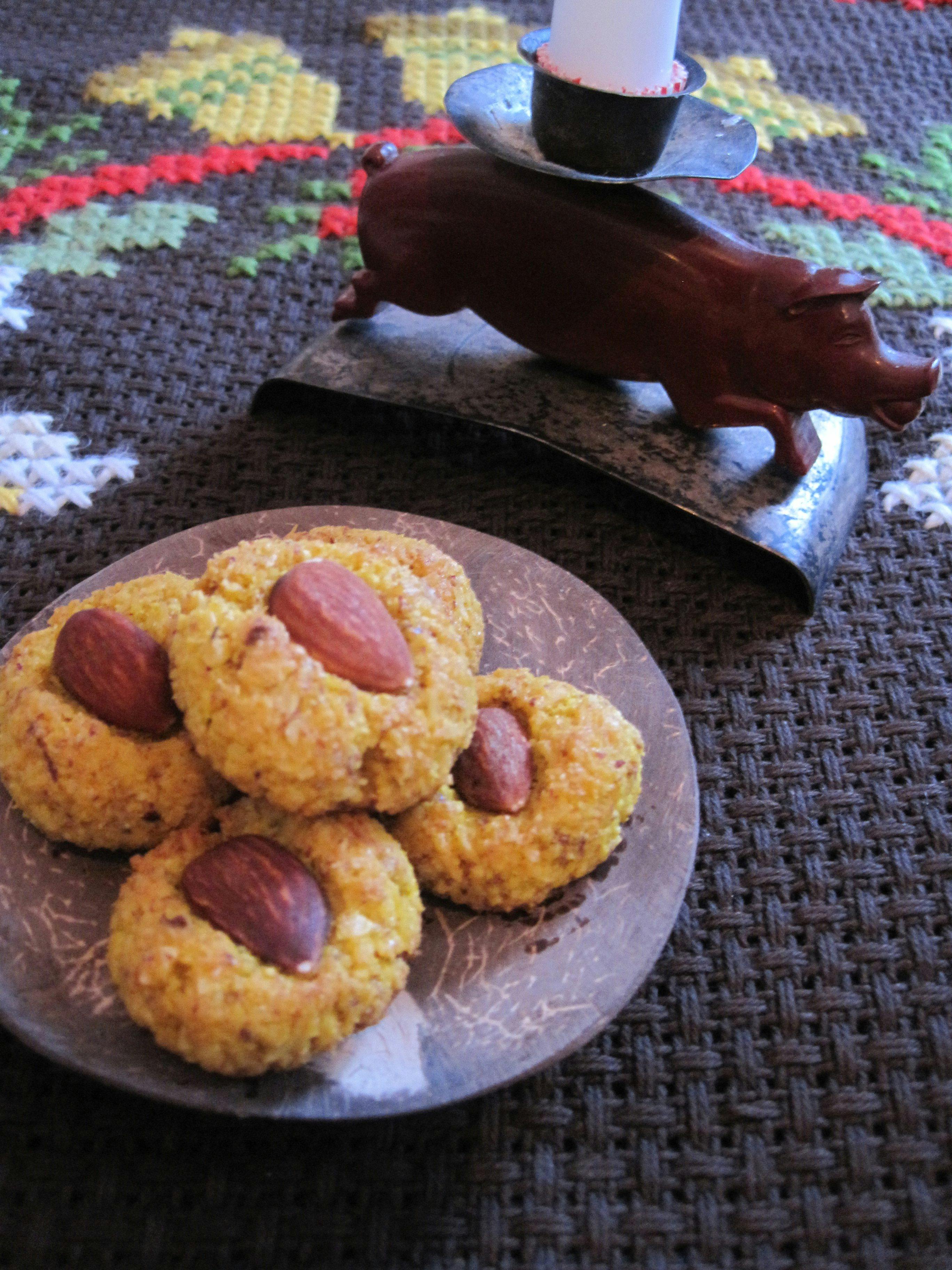 Små mandelkakor med smak av kokos och saffran sprider sin väldoft när de kommer ut ur ugnen. Ett glas med ingefärsspetsad björnbärsglögg blir gott till.