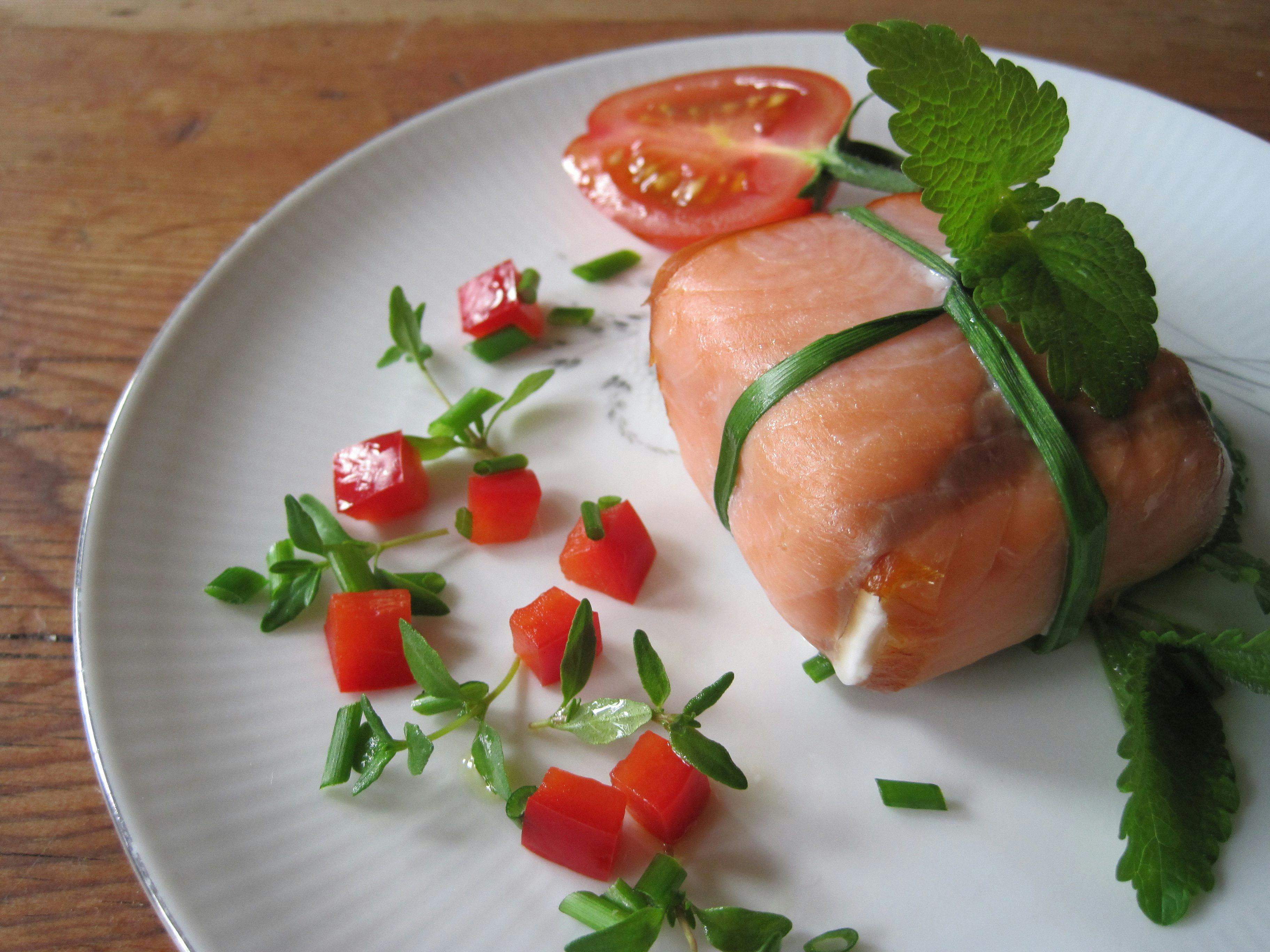 Lägg laxskivorna som ett kryss. Dela osten och lägg en bit mitt på varje laxkryss. Vik in kanterna och knyt runt med ett gräslöksstrå.