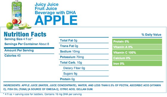 16 mg DHA-fett per portion. En portion är 12 cl. Ett bra Omega-3 tillskott till barn är runt 500 mg DHA+EPA per dag, om de inte får i sig tillräckligt på annat vis. Det motsvarar 1-2 kapslar fiskolja i tillskott. För att få den dagliga mängden från juicen behövs ca 3,5 liter. Vilket också ger över 300 gram socker.