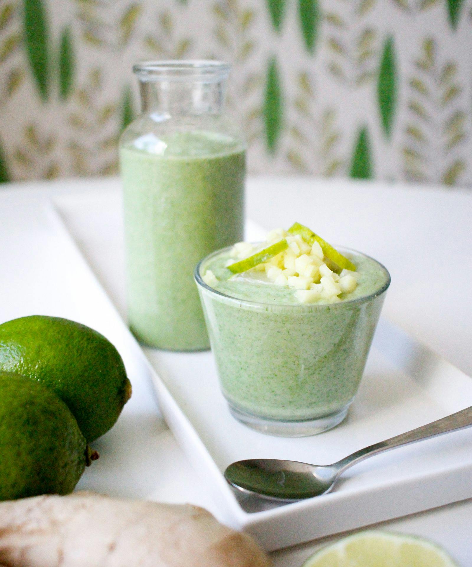 Mixa samman alla ingredienser. Börja med den mindre angivelsen på lime och smaka eventuellt av med mera. Hacka gärna ingefära som du toppar smoothien med.