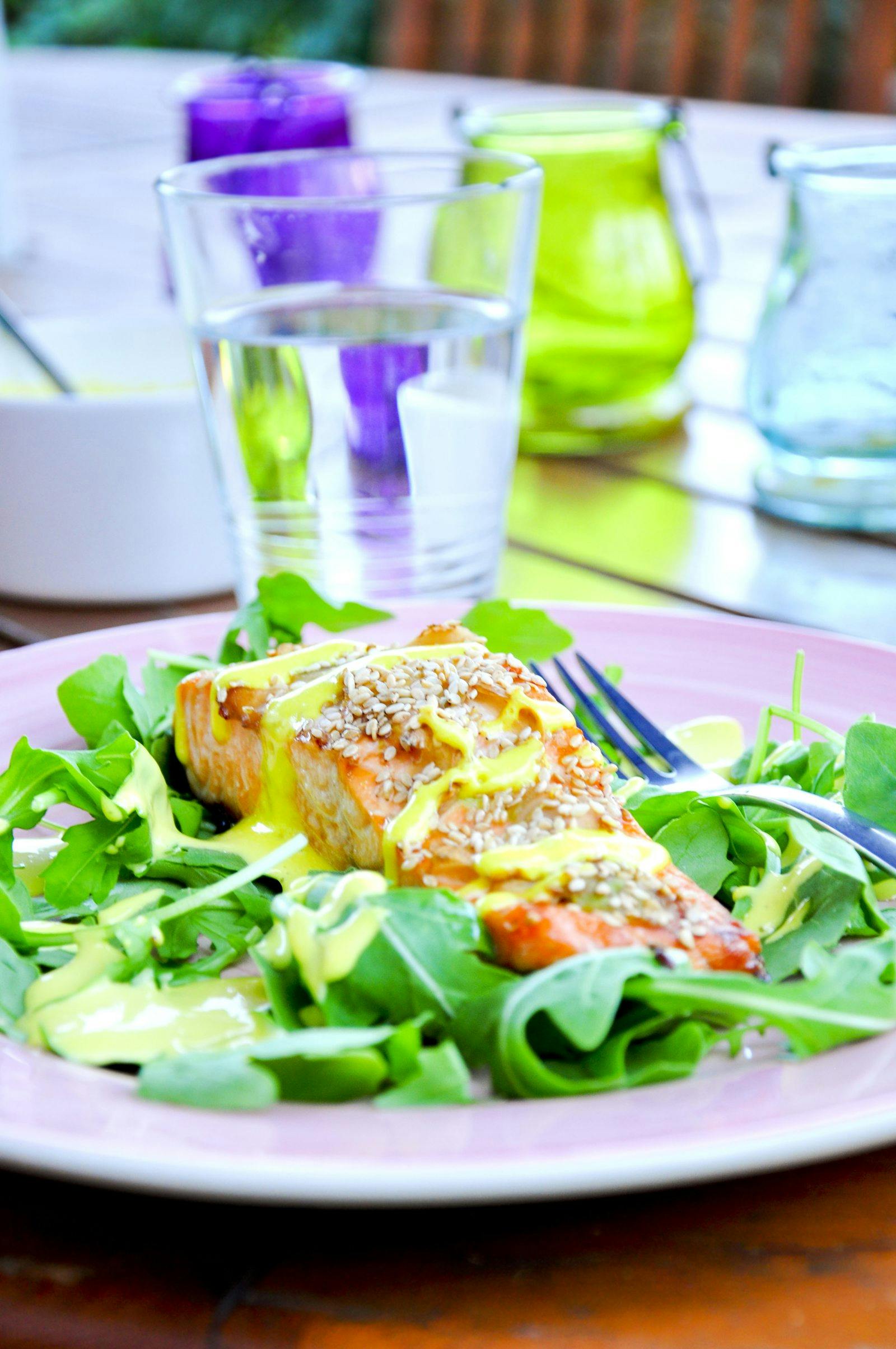 Lax i ugn med smaker från det Japanska köket. Wasabiaiolin gör du lätt som en plätt med stavmixern. Servera gärna med ruccola eller stekt kål med sesamolja.