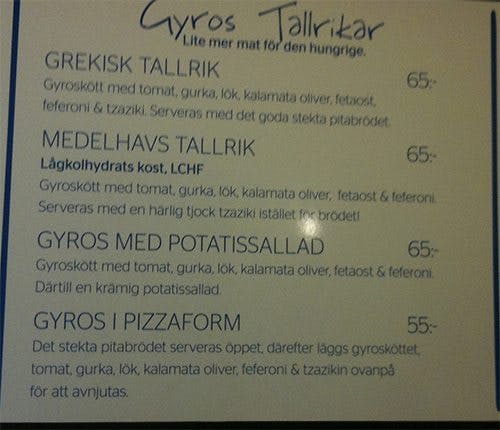 Skickar en bild på en matsedel på en Gyros resturang ( eller snarare hole-in-the-wall resturang) i Malmö som har 3 bord 5 el 6 sittplatser. De flesta hämtar och tar med sig sin mat.