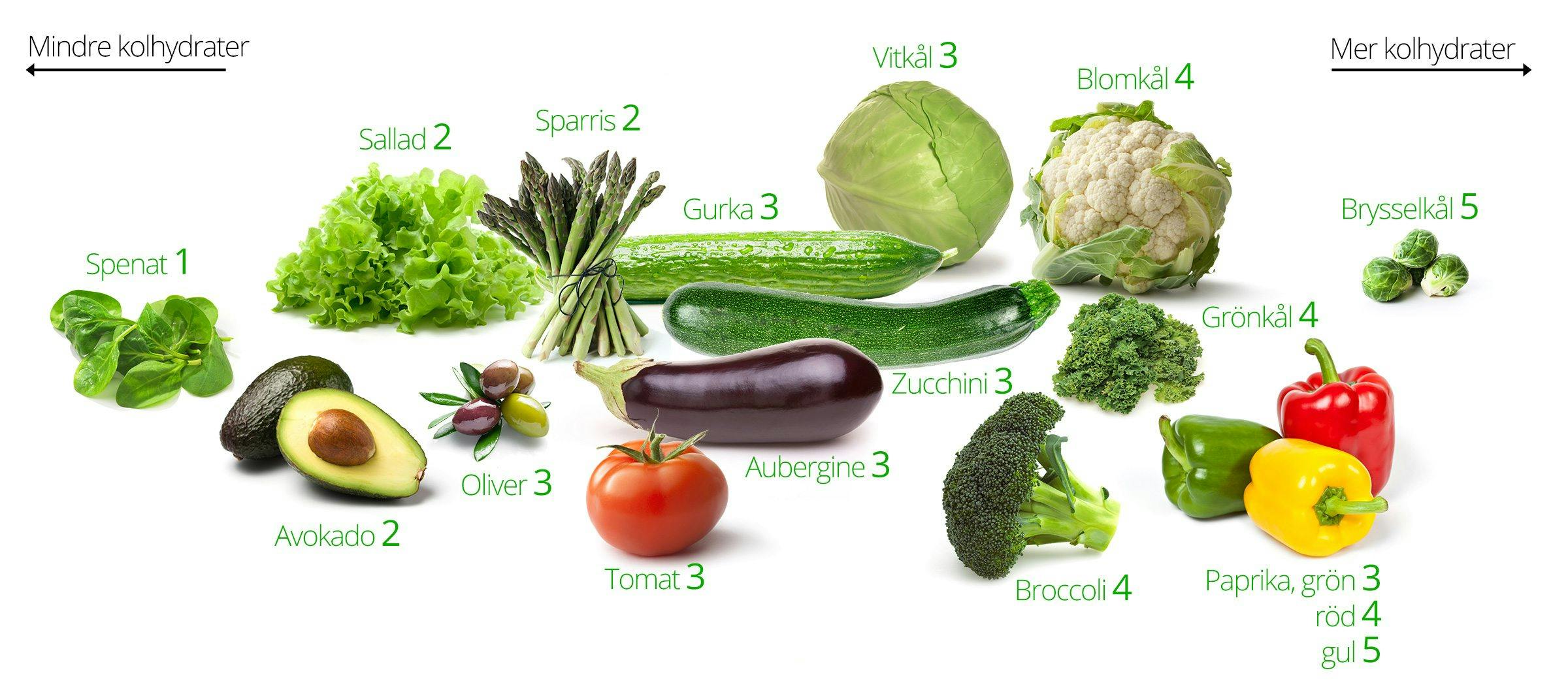 Uppgifterna är tagna från databasen USDA. Det finns små skillnader mellan olika databaser. Det kan vara olika arter av grönsaker som varierar i kolhydratinnehåll och det kan förekomma säsongsvariationer. I de fall där det finns signifikanta skillnader har vi valt ett medelvärde. ↩