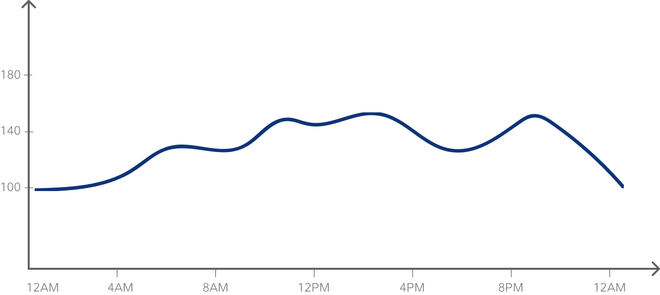 Här är ett exempel på en kurva från en CGM-mätare som föreslår att risken är liten att gryningsfenomenet kommer att leda till negativa hälsoutfall. Peaken tidigt på morgonen är uppe på 120 mg/dL (6,7 mmol/l) och det är det högsta värdet på hela dagen. Nivåerna efter måltid går inte över 110 mg/dl (6,1 mmol/l) och går tillbaka till baseline inom en timme efter höjningen.