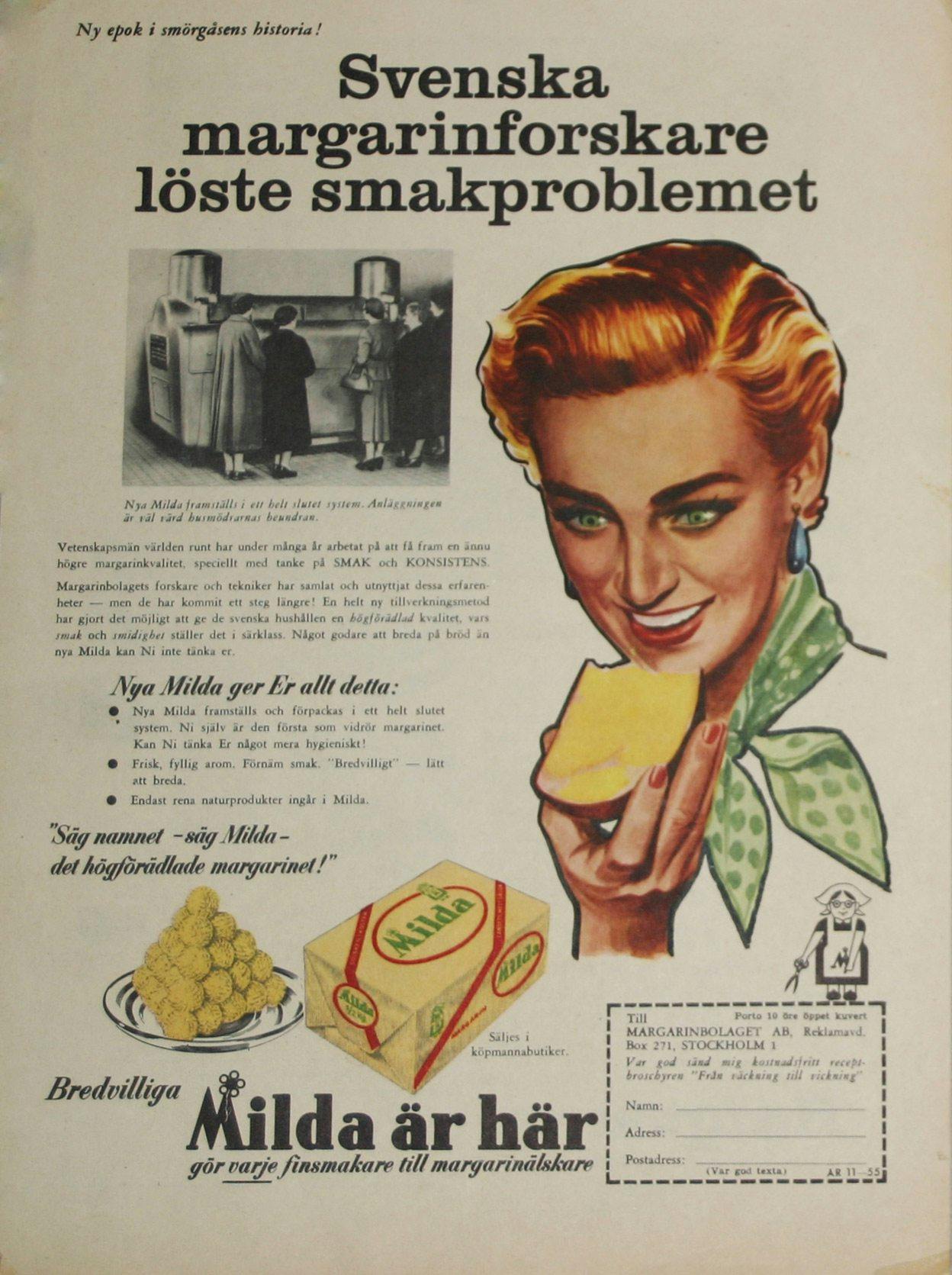 Så hygieniskt det var förr i tiden, Milda margarin. Högförädlat, direkt ur en kemitank. Vetenskapsmän hade till och med löst smakproblemet(!)