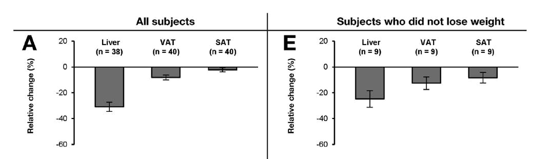 Minskning av mängd fett i levern, bukfett (VAT) och underhudsfett (SAT).Bild från Gastroenterology. 2017 Sep; 153(3): 743–752.