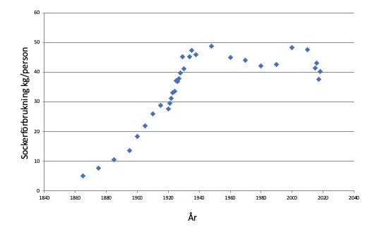 Som ett viktigt försvar för varför socker inte skulle vara så farligt för oss, framför du också att vi inte har ökat konsumtionen av tillsatt socker nämnvärd de senaste åren. Och du har rätt. De senaste decennierna har sockerkonsumtionen legat mellan 40-48 kg. Vad du missar att berätta för dina läsare är att sockerkonsumtionen ökade extremt mycket i början av 1900-talet, med en explosion på 1930-talet (när dagens 80-åringar föddes). Här är en graf över vår sockerförbrukning baserad på siffror från Statistisk årsbok och SCB: