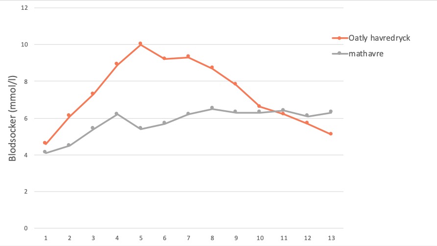 På havredrycken steg blodsockret från 4,5 till 10 mmol/l, en ökning med totalt 5,5 enheter. När blodsockret efter 45 minuter gick över 8,5 mmol/l tog han två enheter insulin för att få ner det.