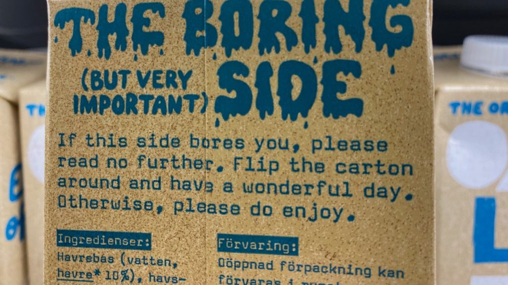 “No milk. No soy. No… eh… whatever.” Det är ett lite annorlunda budskap, för om man är petnoga innebär det att förpackningen borde innehålla rent vakuum. Men jag skulle gissa att de flesta konsumenter kan tro att ”no… eh… whatever” står för inget gluten eller kanske inget tillsatt socker. Det är vanliga hälsopåståenden på livsmedel. Men havre kan generellt innehålla spår av gluten och läser man era ingredienslistor…
