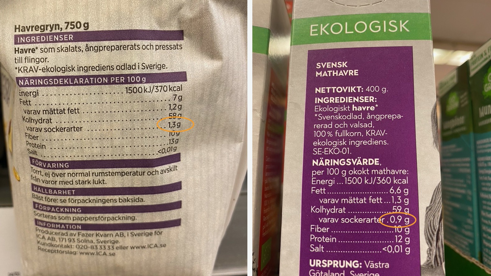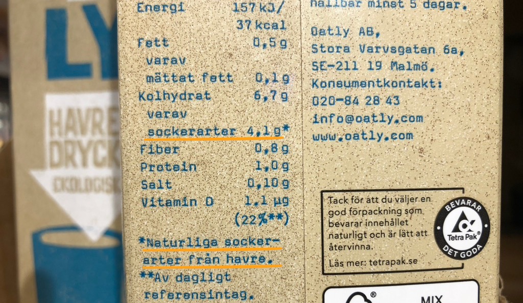 …4,1 gram sockerarter som är naturliga och kommer från havre. Läser man sedan ingredienslistan så utgör det som ni kallar ”havre” en tiondel av innehållet.