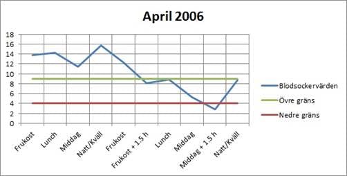 Så här såg mina värden ut under två vanliga dagar i april 2006. Jag satte för många år sedan själv upp en övre och undre gräns på 9 resp 4, med målet att alltid hålla så många som möjligt av mina värden inom detta intervall. Det var svårt på den tiden.