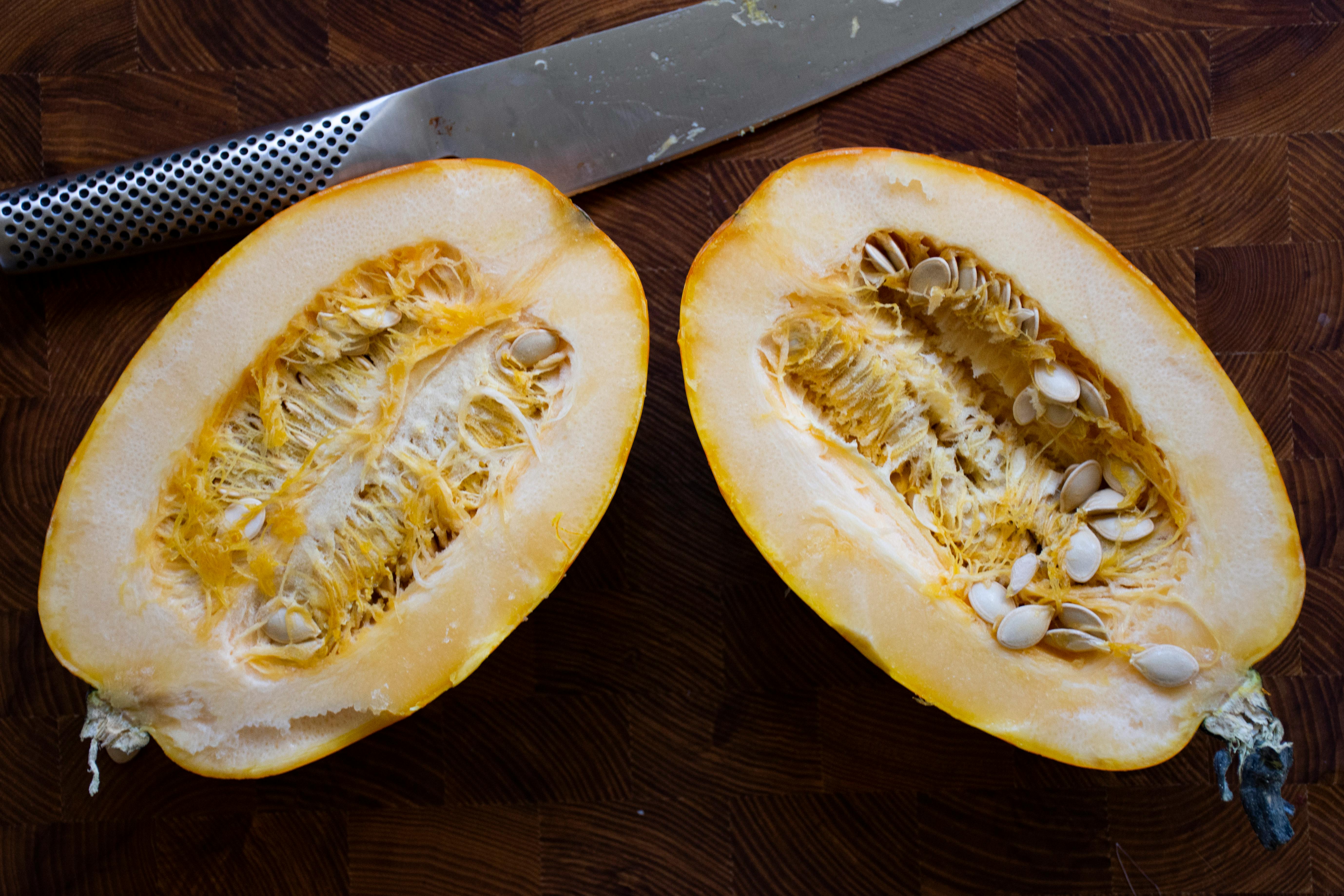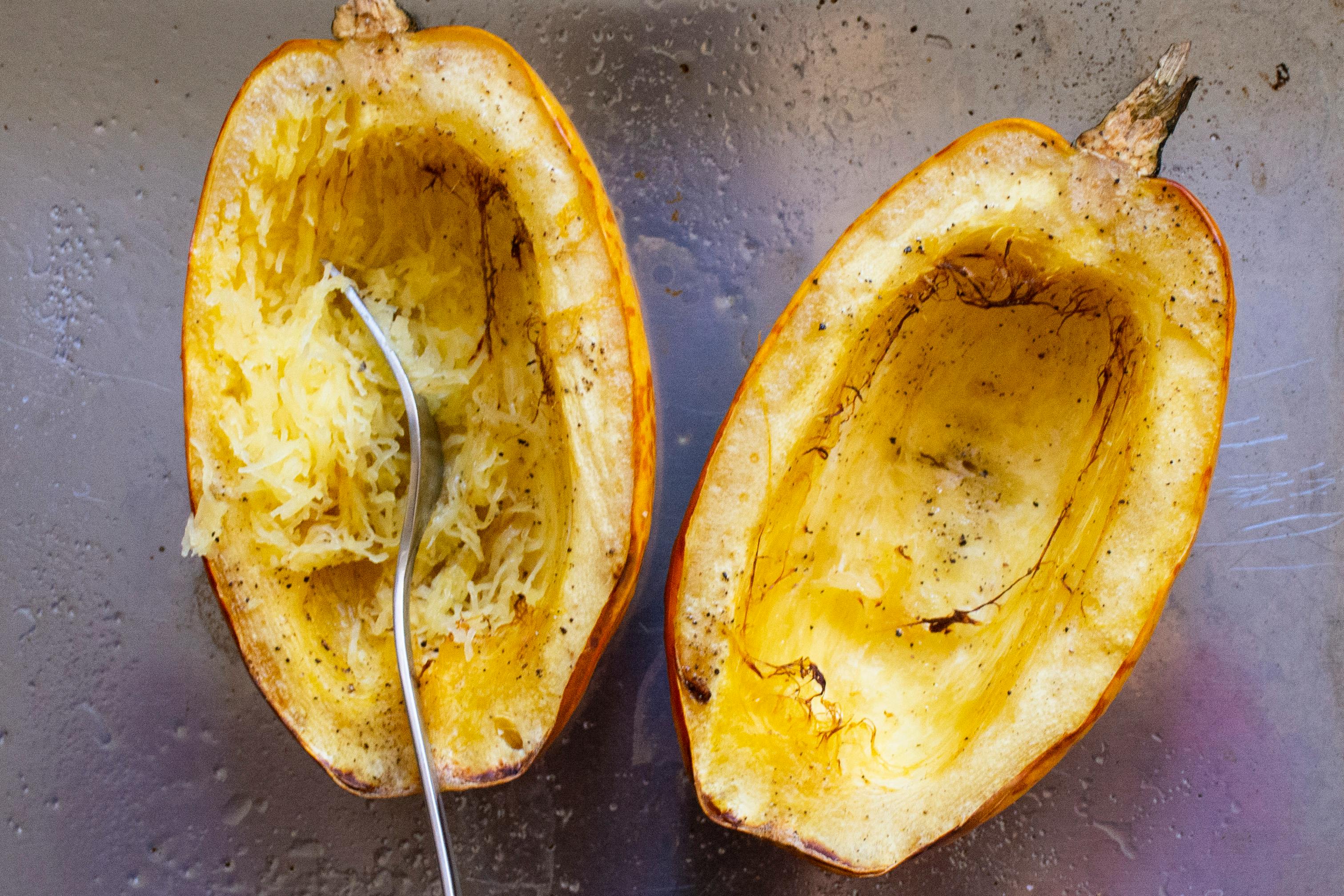 2. Dela spaghettipumpan på hälften genom att skära den med en vass kniv på längden. Var försiktig eftersom den är väldigt hård. Gröp ur kärnorna och det trådiga innanmätet med en sked. Lägg pumpahalvorna med skärsidan uppåt, som båtar, i en ugnsform eller på en plåt. Pensla med olivolja och krydda med salt och svartpeppar. Ugnsbaka tills mjuk, vilket tar cirka 30 minuter beroende på spaghettipumpans storlek. Längre ner på sidan ser du bilder på hur man gör med pumpan.