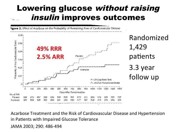 Genom att blockera kolhydratupptaget ser man samma effekt av att reducera mängden glukos som man tillför kroppen. Man ser en minskad absolut risk (ARR) på 2,15 i primär ändpunkt (49% minskad relativ risk). Det är väldigt nära de 1,6% ARR man ser i den nya studien. Detta glömdes bort, eftersom effekten troddes vara en blodsockersänkande effekt snarare än en insulinsänkande effekt. Så nu finns det TVÅ läkemedel som sänker insulin och uppvisar stora positiva effekter.
