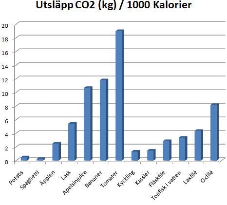 1 liter/kilo apelsinjuice medför 4,8 kilos utsläpp av koldioxid. Produktionen av 1 kilo oxfilé medför utsläpp av 16,2 kilo. Låter som oxfilén är värst? Men inte så snabbt – en liter apelsinjuice innehåller 450 kalorier. Ett kilo oxfilé ca 2000 kalorier. Omräknat till en mängd som ger 1000 kalorier medför apelsinjuicen 10,7 kilo CO2 medan oxfilén ”bara” ger 8,1 kilo!